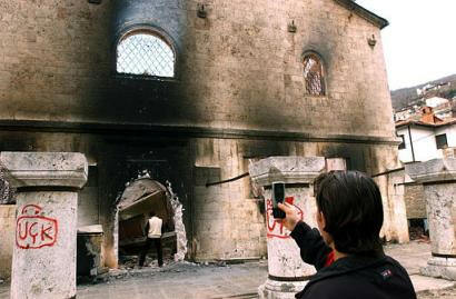 | Aftermath of the March 2004 pogrom: burned-out Serbian church with "UCK" (KLA) graffitti |
